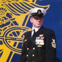 Navy blue Crackerjack top with Seal TEAM Four patch on right shoulder and SO3 rank patch on left